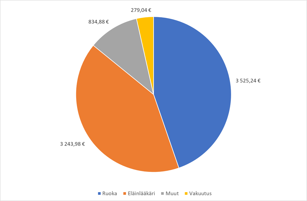 Viimeisenä kommentoidaan eläinlääkärikustannuksia, mitkä ovat olleet neljän vuoden aikana pöyristyttävät 3243.98 euroa, mikä tekee noin 810 euroa vuodessa. Tässä pitää kuitenkin mainita se, että jokainen euro ja sentti on mennyt vain ja ainoastaan vanhempaan koiraamme Venlaan, koska nuorempi koira Hugo on ollut tähän asti (”koputtaa puuta”) täysin terve. Venlalla on poistettu niin kohtua ja poistettu hampaita huonon kunnon vuoksi kolme kertaa. Pelkästään hampaiden poistaminen on vuosien varrella maksanut 2415 euroa. Jos siis mitään ongelmia hampaiden kanssa ei olisi tullut, olisi eläinlääkärikustannukset viimeisen neljän vuoden aikana ollut vain 800 euroa.