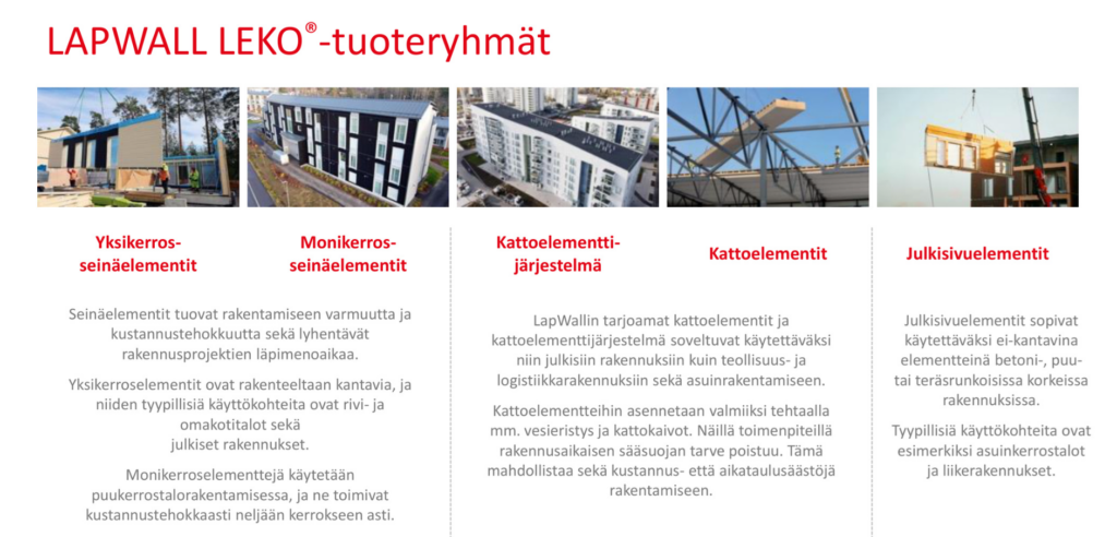 LapWall on yksi alan harvoista valopilkuista. Yhtiö valmistaa puisia seinä- ja kattoelementtejä. Seinäelementit menevät pääosin asuntorakentamiseen, ja kattoelementit teolliseen rakentamiseen. LapWall ei myy suoraan kuluttajille, vaan yhtiön asiakkaita ovat rakennusliikkeet ja talotehtaat.