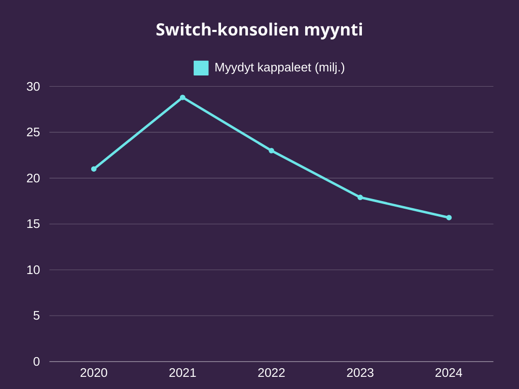 Switch myi ensimmäisenä vuonnaan noin 15 miljoonaa kappaletta. On kuitenkin hyvä muistaa, että Nintendon brändi ei tuolloin ollut yhtä vahva kuin tänään. Toisaalta nyt monella kuluttajalla on jo Switch, joten tarvitsevatko he seuraavaa mallia? Korvaavalle konsolille ei välttämättä ole huutavaa tarvetta, mikä laskee myyntimääriä. Itse laskelmissani odotan, että Switch 2 myy ensimmäisenä vuonnaan 20 miljoonaa kappaletta.